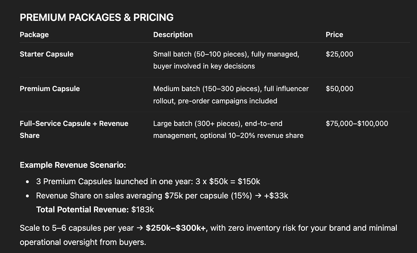 Optional: take a percentage of capsule sales if your team executes the full launch.
